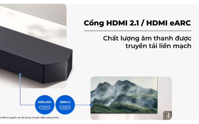 Loa thanh được trang bị kết nối HDMI tiên tiến, hỗ trợ truyền tải nội dung HDR10+ với khả năng 4K Pass-Through 120Hz. Bên cạnh đó, chuẩn HDMI-eARC cho phép truyền âm thanh chất lượng cao giữa TV và các thiết bị ngoại vi một cách liền mạch, ổn định. Cổng HDMI 2.1 kết hợp cùng HDMI-eARC góp phần tối ưu hiệu suất âm thanh, cho trải nghiệm giải trí sống động và chân thực hơn.