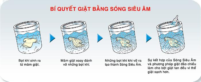 Sanyo là một trong những hãng tiên phong đi đầu trong việc ứng dụng công nghệ này vào sản phẩm máy giặt của mình. Dưới “sức mạnh” của sóng siêu âm, hàng triệu bọt khí li ti vỡ ra mỗi phút giúp sẽ “len lỏi” vào giữa các sợi vải “đánh tan” chất bẩn và vết ố, làm tăng hiệu quả giặt sạch cho quần áo.