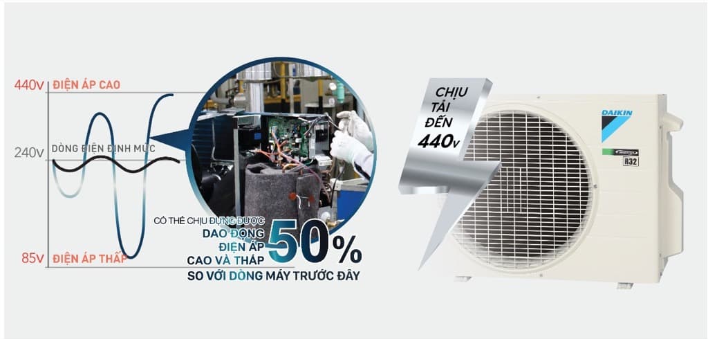 Bộ bo mạch của thiết bị có độ bền cực cao chịu được điện áp lên đến 440W hoạt động trên phạm vi rộng mà không cần phải lắp đặt thêm bộ ổn áp. Khi điện áp cao hơn hoặc thấp hơn phạm vi hoạt động, thiết bị sẽ tự ngắt kết nối, bảo vệ bo mạch một cách toàn diện. Điều hòa hoạt động hiệu quả với mức điện áp từ 150V đến 264V và đối với điện áp 1 pha thì chịu được lên đến 440V.