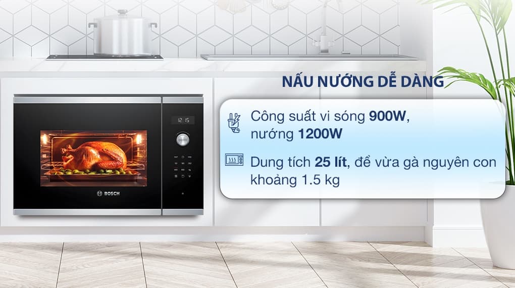 Lò vi sóng Bosch BEL554MS0B kết hợp hiệu suất cao cùng thiết kế tinh tế. Với lắp âm thông minh, khoang thép không gỉ bền bỉ, sản phẩm tạo nên không gian gọn gàng, sang trọng. Dung tích 25 lít phù hợp gia đình đông người, công suất 900W vi sóng và 1200W nướng đa dạng chế biến thực phẩm. Điều khiển đơn giản, tích hợp nhiều tiện ích giúp tiết kiệm thời gian và công sức. Lò vi sóng Bosch sẽ giúp công việc nấu nướng trở nên đơn giản, tiện nghi hơn, mang nhiều món ăn ngon cho gia đình.