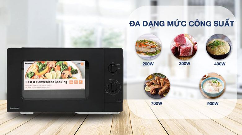 Chiếc lò vi sóng Panasonic có tổng công suất hoạt động tối đa lên đến 900W mạnh mẽ được chia thành 5 mức công suất khác nhau làm chín mọi loại thực phẩm nhanh chóng, tiện lợi, tiết kiệm thời gian.