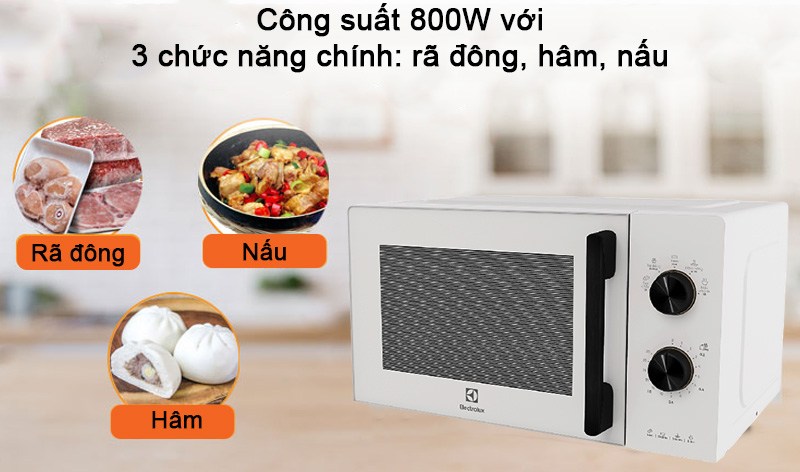 Thực phẩm khi được nấu bằng Lò vi sóng Electrolux 20 lít EMM20K22W được làm chín đồng đều nhanh chóng khi có công suất rất mạnh mẽ lên đến 800W. Ngoài ra, máy cũng chia thành 5 mức công suất khác nhau từ nhỏ đến lớn để người dùng linh hoạt lựa chọn tùy theo từng món ăn cần nấu.