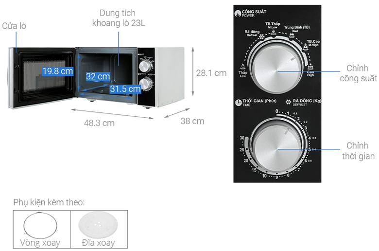 Chiếc lò vi sóng thiết kế hệ thống gồm 2 núm xoay tiện lợi, giúp người dùng dễ dàng điều chỉnh nhiệt độ, thời gian hoạt động một cách đơn giản và lựa chọn mức công suất phù hợp với từng nhu cầu sử dụng của người dùng.
