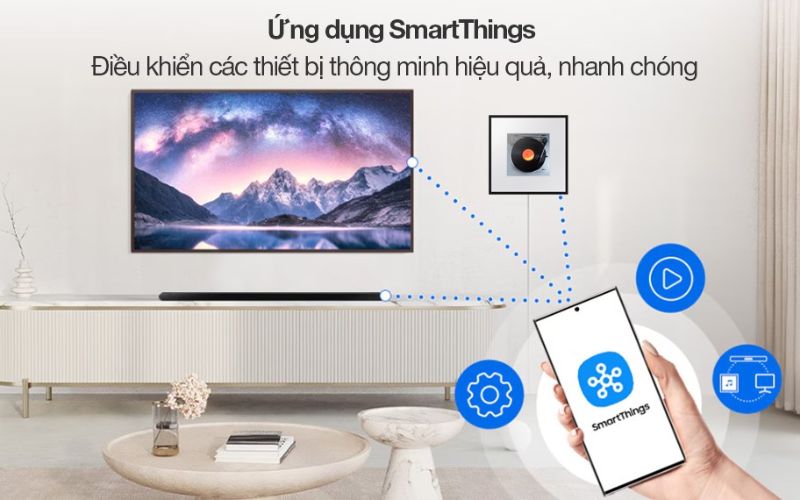 Hơn nữa, bạn còn có thể kết nối loa thanh với ứng dụng SmartThings rồi sử dụng các thiết bị thông minh như di động điện thoại, máy tính bảng, điều khiển các tính năng của loa mọi lúc, mọi nơi, sử dụng tiện lợi hơn.