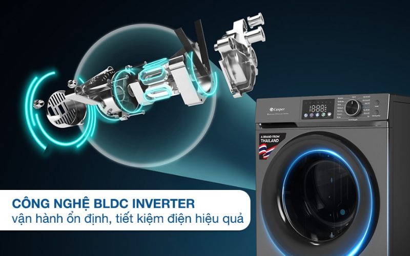 Máy giặt nhà Casper ứng dụng động cơ tiên tiến Inverter BLDC cho quá trình giặt giũ diễn ra ổn định hơn, quần áo được giặt sạch sẽ, đặc biệt là vận hành êm ái, bền bỉ theo thời gian.