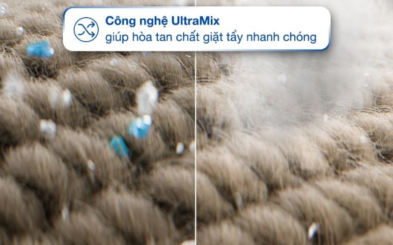 Công nghệ UltraMix hòa tan hoàn toàn chất giặt tẩy cùng chất làm mềm hoàn toàn để sau khi vào lồng giặt được phát huy đầy đủ công dụng cho quần áo được giặt sạch hiệu quả, không còn sót dính các cặn bột giặt.
