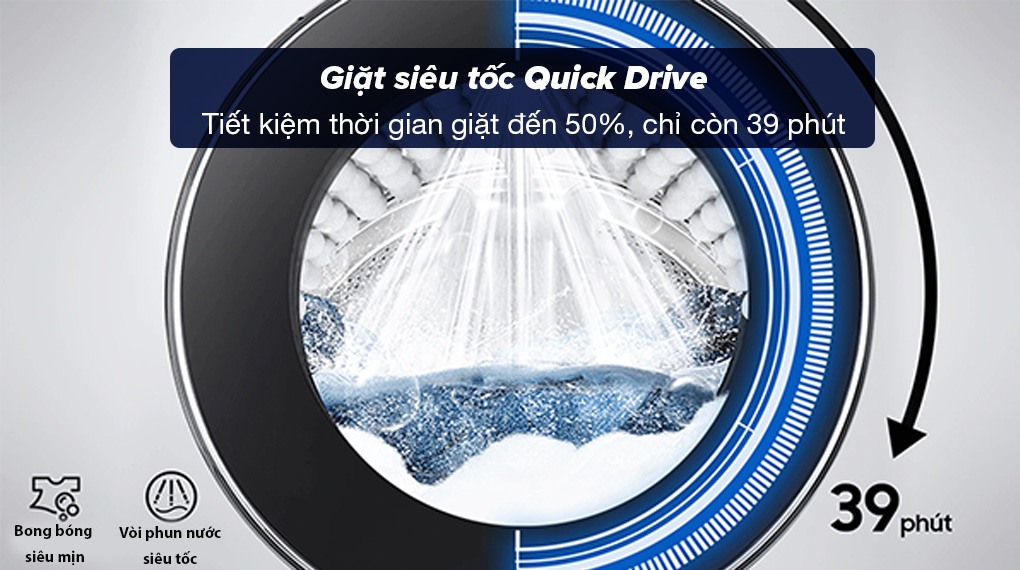 Đặc biệt, máy trang bị chế độ giặt siêu tốc Quick Driver tăng áp lực nước mạnh mẽ, hòa tan bột giặt rồi đẩy nhanh quá trình thẩm thấu xà phòng vào trong sợi vải. Quần áo được loại bỏ vết bẩn một cách nhanh chóng, làm sạch hiệu quả chỉ trong vòng 39 phút, tiết kiệm đến 50% thời gian giặt.