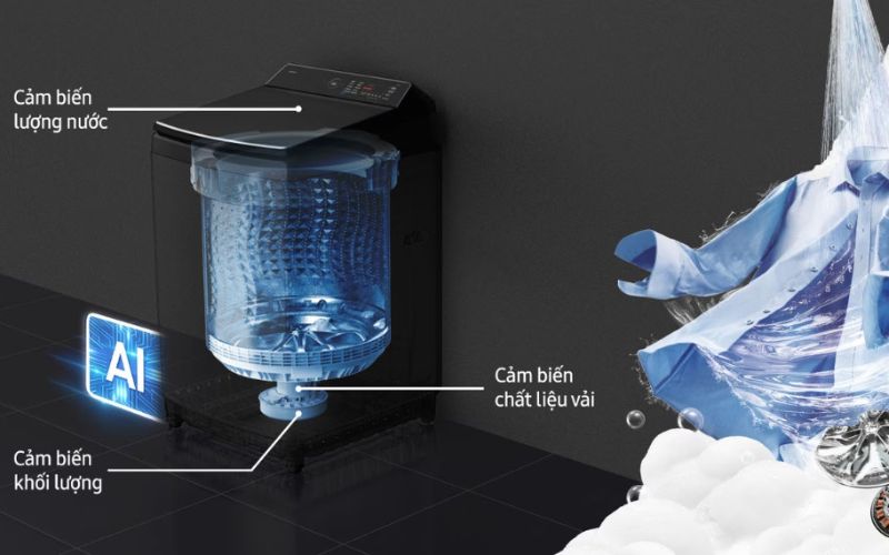 Công nghệ giặt AI tích hợp cảm biến khối lượng, chất liệu vải rồi tự động điều chỉnh lượng nước, thời gian, chuyển động, tối ưu chương trình giặt, giặt sạch quần áo hiệu quả và đặc biệt là bảo vệ sợi vải.