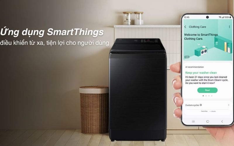 Đặc biệt, máy còn hỗ trợ kết nối SmartThings, nên mọi lúc mọi nơi bạn dễ dàng điều khiển, theo dõi, tối ưu chương trình giặt từ xa ngay trên điện thoại, tạo sự tiện nghi tối đa trong cuộc sống hiện đại.