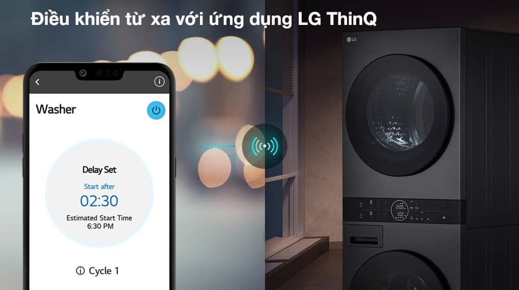 Kết nối với ứng dụng Smart ThinQ để người dùng dù ở bất kỳ đâu cũng có thể dễ dàng điều khiển, kiểm soát, lựa chọn các chương trình giặt phù hợp… khi chỉ cần kết nối với wi-fi. Ngoài ra, ứng dụng con giúp bạn giám sát, theo dõi các hoạt động của máy, lượng điện năng tiêu thụ, nhận các thông báo lỗi…