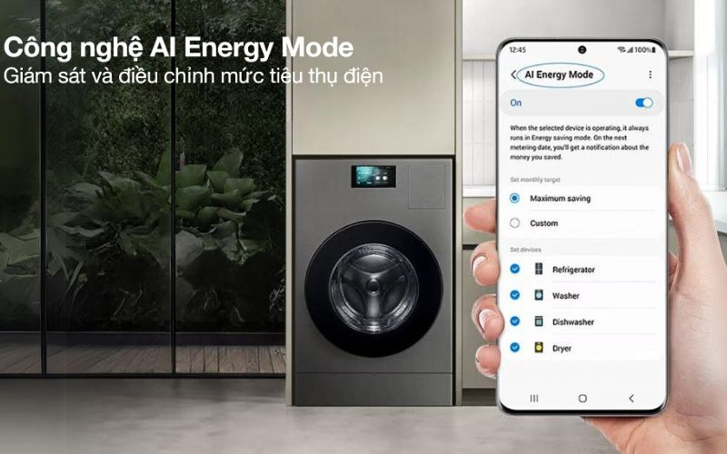 Hơn nữa, để nâng cao hiệu quả tiết kiệm điện, máy Samsung còn sở hữu thêm công nghệ AI Energy Mode, liên kết cùng app SmartThings nên kể cả khi từ xa, bạn cũng có thể giám sát, chỉnh mức điện tiêu thụ, giặt sấy hiệu quả hơn nhưng không cần hao tốn quá nhiều năng lượng.