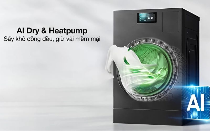 Ngoài chức năng giặt, sản phẩm còn là chiếc máy sấy bơm nhiệt AI Heatpump sấy khô quần áo hiệu quả, bảo vệ sợi vải, phom dáng trang phục, đỡ mất công phơi, là ủi.