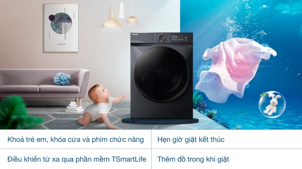 | Tiện ích: | Chỉnh nhiệt độ nước Chỉnh số vòng vắt Hẹn giờ giặt kết thúc Khóa trẻ em Kết nối Wifi và điều khiển từ xa bằng điện thoại thông minh qua phần mềm TSmartLife Thêm đồ trong khi giặt Van sử dụng mực nước thấp |