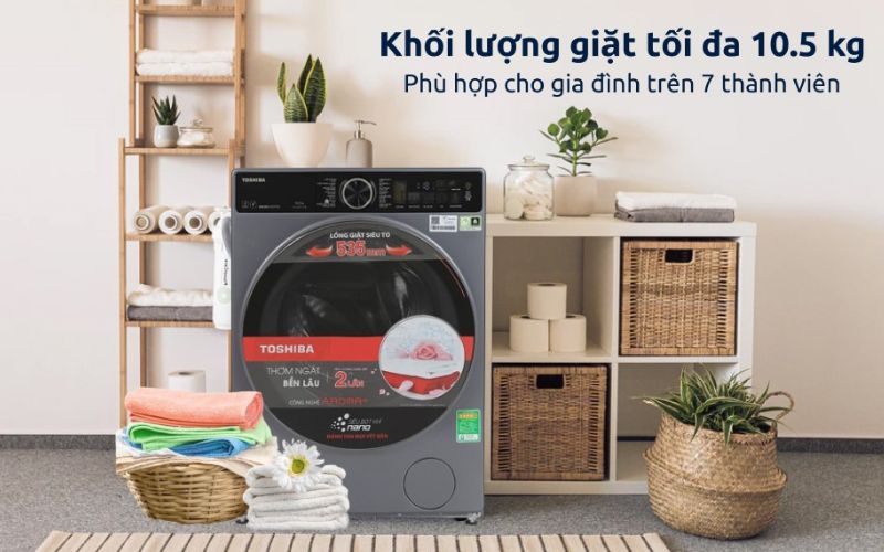 Lồng giặt được thiết kế rộng rãi có khả năng giặt tối đa lên đến 10.5 Kg, thích hợp sử dụng cho gia đình đông người như trên 7 thành viên hay nhà có các bé nhỏ, nhu cầu giặt giũ mỗi ngày cao.