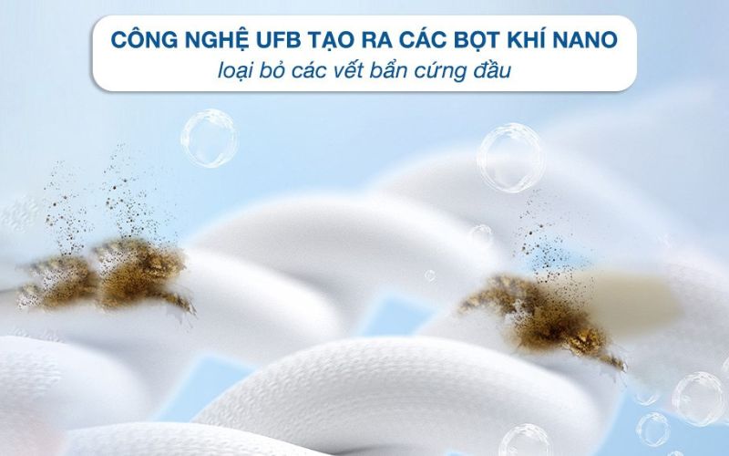 Công nghệ UFB (Ultra Fine Bubble) tạo hàng triệu bọt khí nano siêu nhỏ, thấm sâu vào từng sợi vải, đánh bay các vết bẩn cứng đầu, ngăn ngừa ố vàng và hạn chế cặn chất giặt tẩy bám lại sau khi giặt.