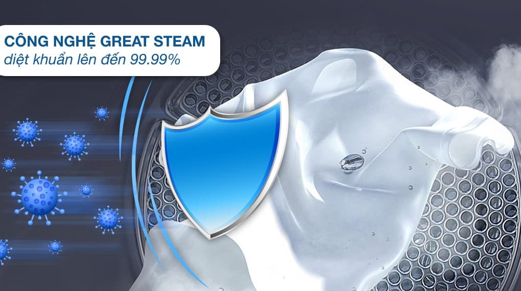 Được trang bị công nghệ Great Steam, bên trong lồng giặt sẽ xuất hiện làn hơi nước nóng ở nhiệt độ cao. Làn hơi nước nóng này đã giúp loại bỏ hiệu quả 99.99% vi khuẩn, các tác nhân gây dị ứng có thể xuất hiện trên bề mặt quần áo một cách nhanh chóng, hiệu quả. Với kết quả này, người dùng sẽ có những bộ quần áo không chỉ thơm tho mà còn được làm sạch khuẩn, an toàn cho làn da, đặc biệt thích hợp cho các gia đình có trẻ nhỏ.