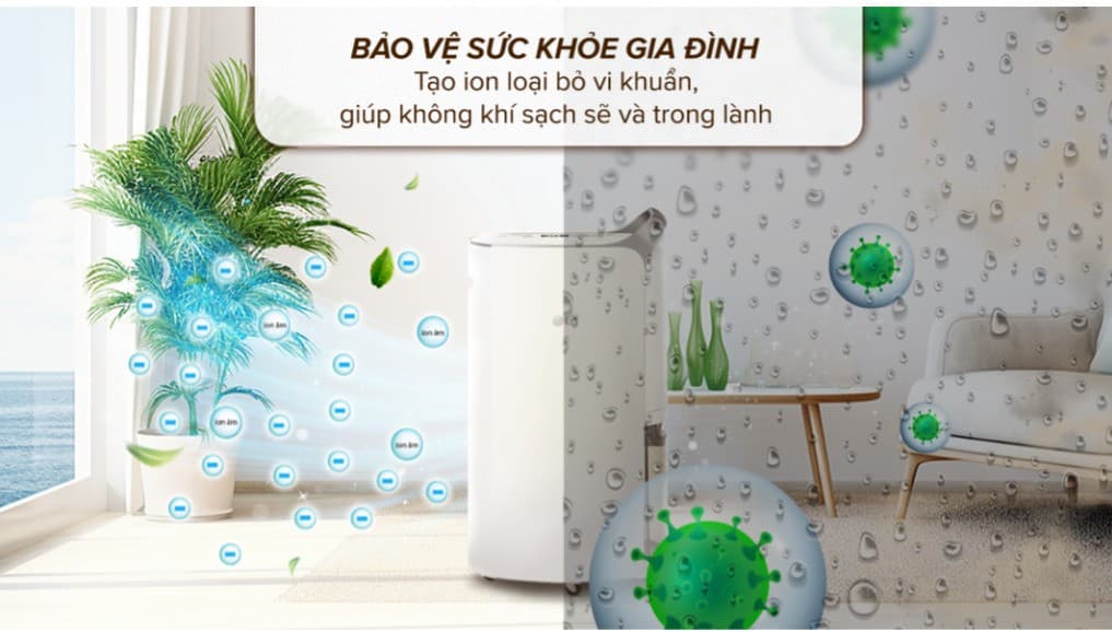 Ngoài khả năng hút ẩm, không gian trong phòng sẽ vô cùng thoáng đãng sạch sẽ. Đó là nhờ máy hút ẩm LG tích hợp các Nano Ion có khả năng loại bỏ các vi khuẩn có hại trong không khí. Qua đó, môi trường sống trong phòng trong lành hơn, nâng cao sức khỏe cho mọi người thân trong gia đình.