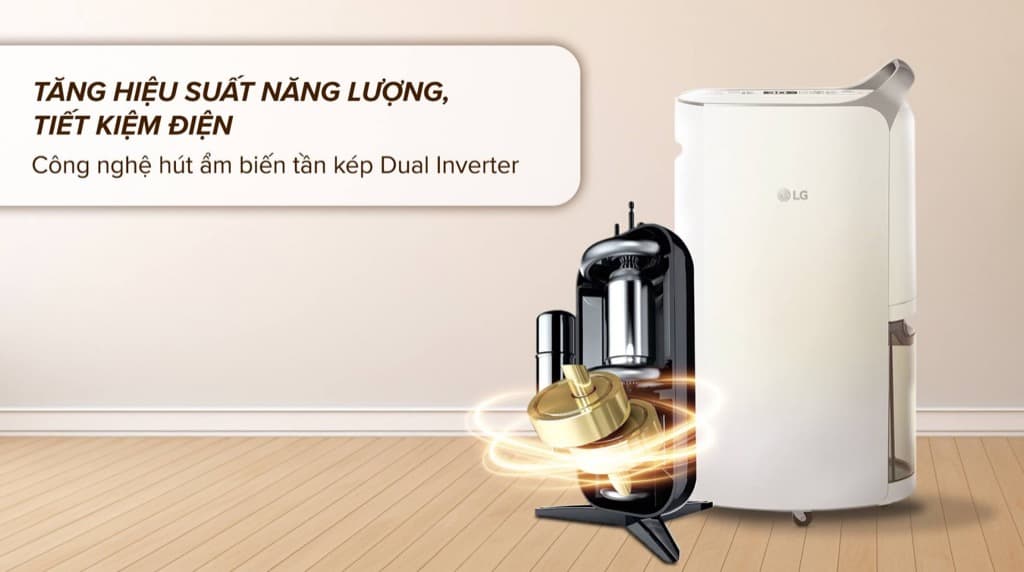 Máy hút ẩm LG Dual Inverter 16L MD16GQSE0.ABAE trang bị công nghệ máy nén biến tần kép Dual Inverter. Chiếc máy nén biến tần này cần ít thời gian chạy hơn nên có hiệu suất năng lượng cao hơn giúp khả năng hút ẩm vô cùng hiệu quả. Chính vì vậy, máy hoạt động với mức năng lượng điện thấp hơn, tiết kiệm chi phí sử dụng.