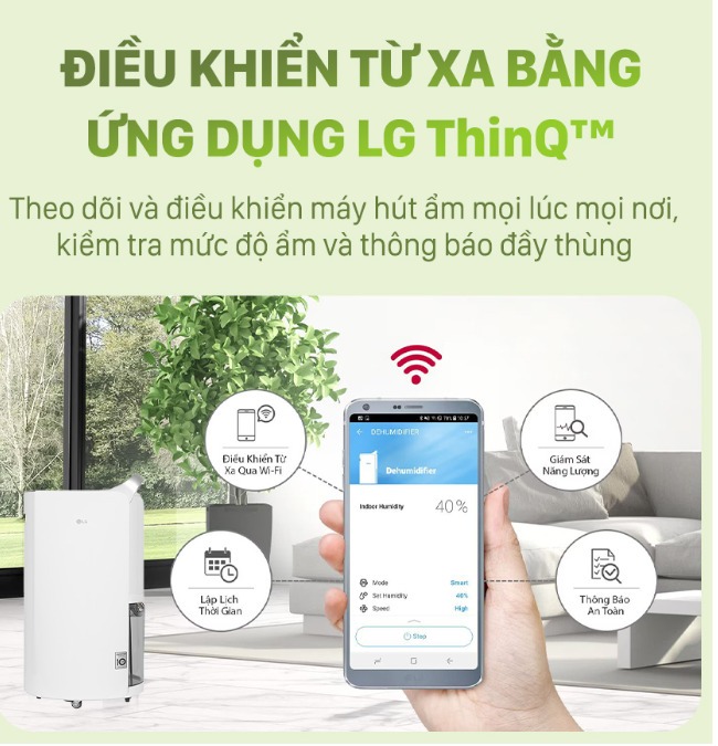 Đặc biệt, chiếc máy hút ẩm còn hỗ trợ kết nối với ứng dụng LG ThinQ trên điện thoại thông minh của người dùng. Qua đó, dù ở bất kỳ nơi nào, thời gian nào người dùng cũng có thể theo dõi tùy chỉnh các chức năng của máy, nhận thông báo khi bình chứa nước đầy hoặc cài đặt thời gian tắt mở máy.