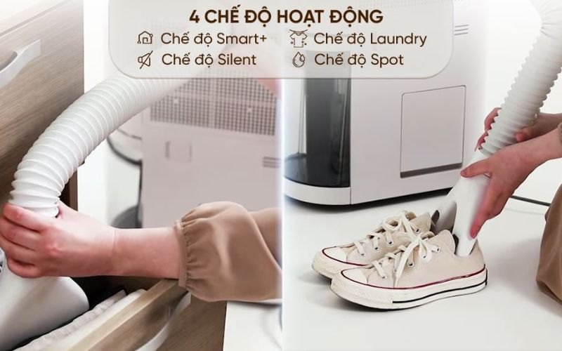 Máy tích hợp 4 chế độ hoạt động gồm Smart - Silent - Laundry - Spot, tùy vào độ ẩm không khí trong phòng, người dùng có thể linh hoạt tùy chỉnh theo từng nhu cầu sử dụng.