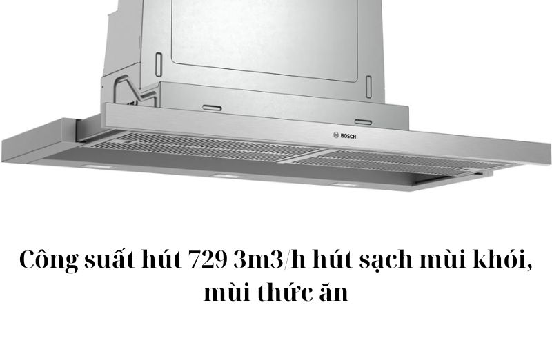 Công suất hút của máy mạnh mẽ có thể đặt đến mức 729 m3/h gồm 3 mức thường cùng 1 mức tăng cường Power Boost cho bạn linh động lựa chọn phụ thuộc vào lượng khói, mùi thức ăn, trả lại sự thoáng đãng, tươi mới cho không gian.