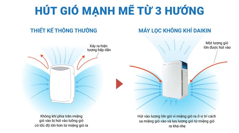 Thiết kế 3 hướng hút gió mạnh mẽ hút sạch mọi khí bẩn