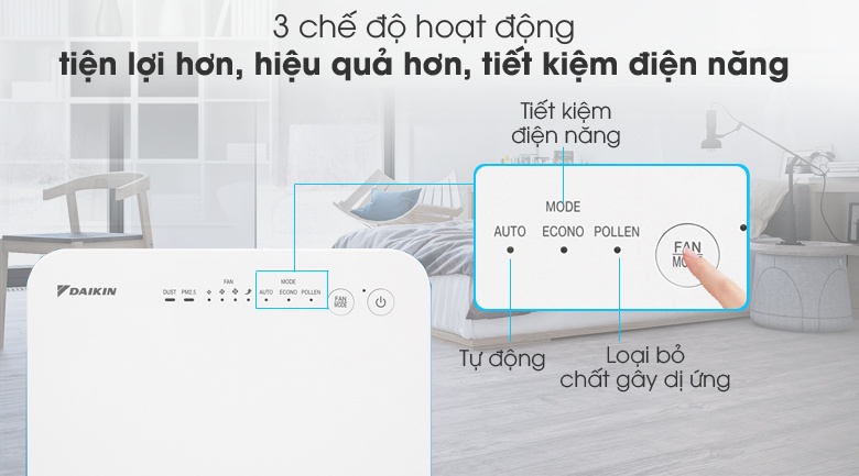 - Chế độ Econo: Chuyển đổi linh hoạt giữa chế độ yên tĩnh và thấp, đảm bảo vẫn lọc sạch không khí nhưng sẽ giúp tiết kiệm điện năng tiêu thụ.