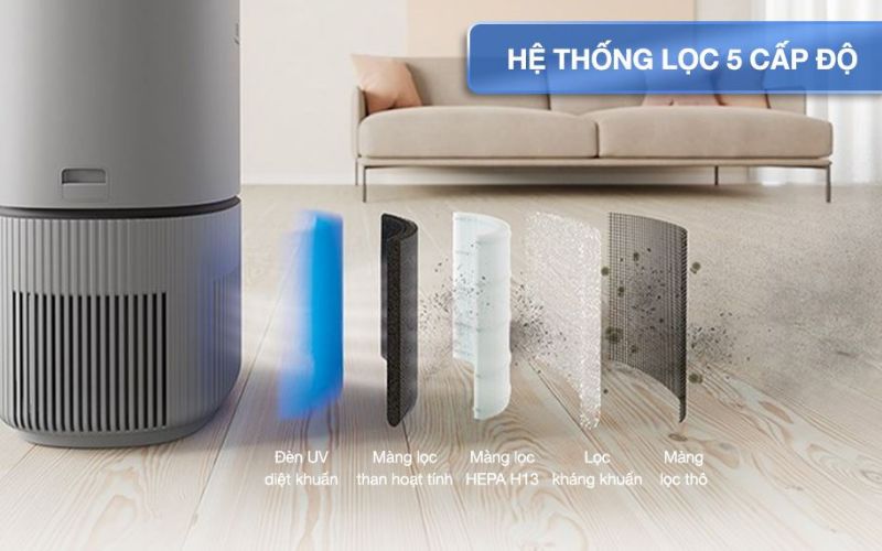 Hệ thống lọc 5 cấp độ lọc lọc sạch các hạt bụi, bụi mịn, mùi hôi khó chịu.