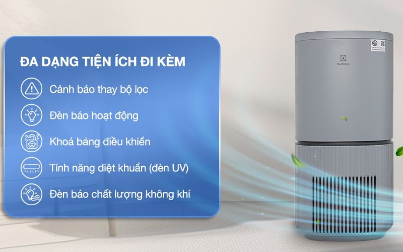 | Tiện ích | Tính năng diệt khuẩn (đèn UV), Đèn báo chất lượng không khí, Cảnh báo thay bộ lọc, Đèn báo hoạt động, Khoá bảng điều khiển |