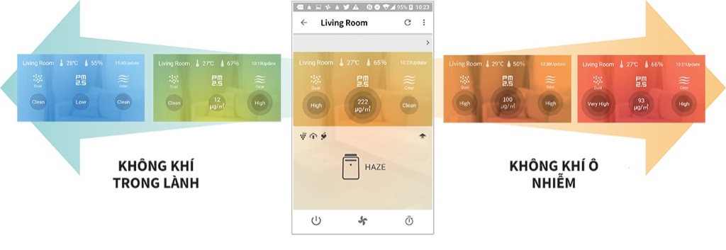- 5 cảm biến hiện đại: Bụi PM2.5, mùi, nhiệt độ, độ ẩm và ánh sáng