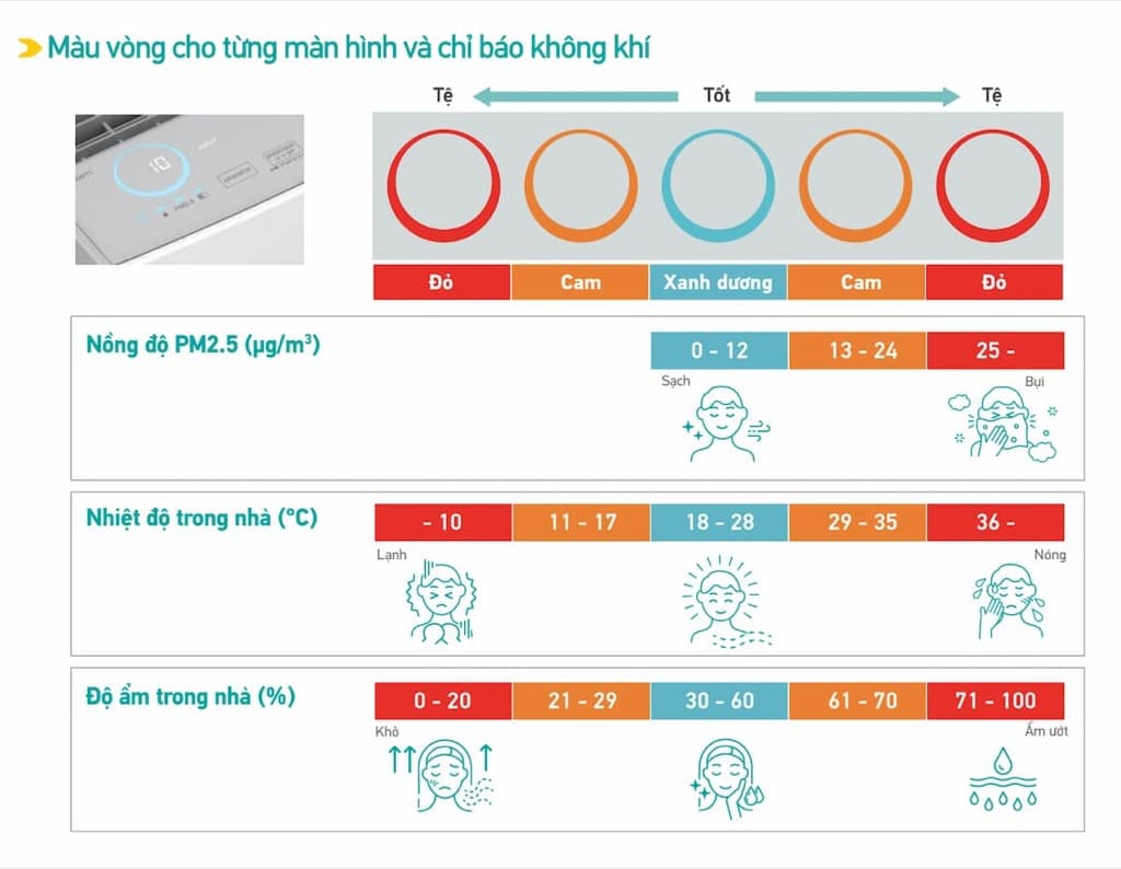 | Đèn báo chất lượng không khí | Có (3 màu sắc: Xanh, Cam, Đỏ) |