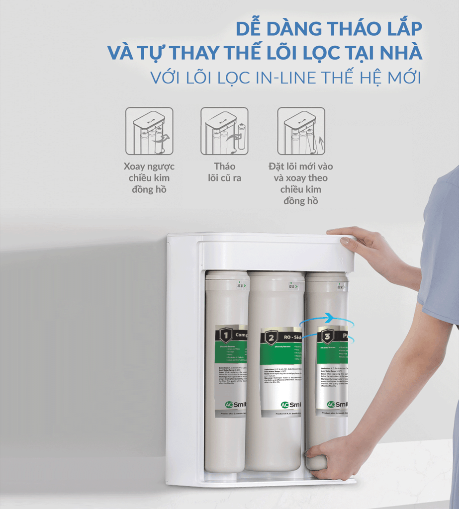 Máy lọc nước A. O. Smith được trang bị lõi lọc nguyên khối In-line công nghệ mới, giúp hạn chế tình trạng rò rỉ nước, dễ dàng tháo lắp ngay tại nhà. Cùng với đó là hệ thống cảnh báo tự động được lắp đặt ngay trên thân máy hoặc tại vòi nước, do đó bạn có thể quan sát lõi lọc, kịp thời thay thế lõi đảm bảo sự tinh khiết cho nguồn nước. Do đó, bạn không cần phải ghi nhớ khi nào cần thay lõi cho máy, và bạn cũng có thể tự tay tháo và lắp ngay tại nhà một cách dễ dàng vì thiết kế đơn giản nhưng mang lại hiệu quả cao.