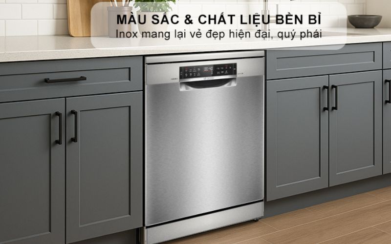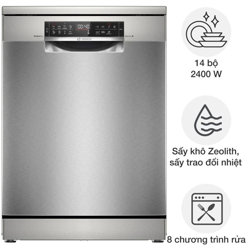 Máy rửa bát Bosch hiện đại, công suất rửa 14 bộ đồ ăn, 8 chương trình rửa đa năng.