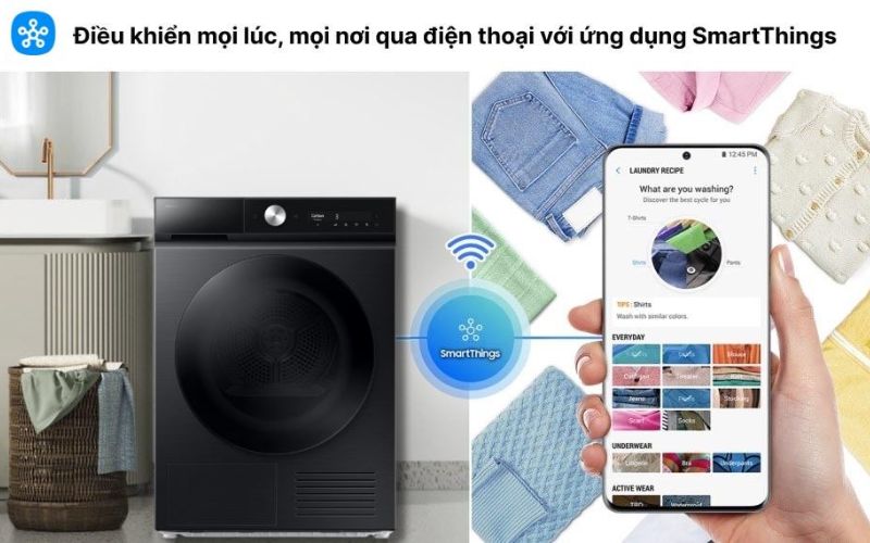 Kết nối thông minh với ứng dụng SmartThings cho phép từ xa người dùng sử dụng điện thoại theo dõi, điều khiển, tối ưu hoạt động của máy.