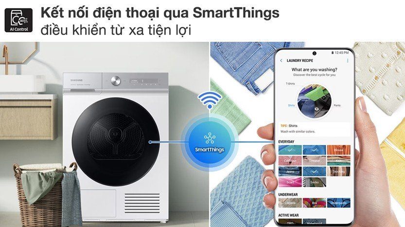 Tiện ích | Bảng điều khiển thông minh AI Control Bảng điều khiển thông minh AI Chức năng Smart Check Công nghệ sấy diệt khuẩn Hygiene Care Công nghệ Wrinkle Prevent chống nhăn Hẹn giờ sấy Khóa trẻ em Kết nối điện thoại qua app SmartThings Tự động mở cửa Công nghệ sấy bơm nhiệt Hybrid Heatpump Sấy khô siêu tốc QuickDrive 35 phút Silent Dry vận hành êm ái, giảm ồn, chống rung đến 30% Cài đặt ngôn ngữ hiển thị Tiếng Anh hoặc Tiếng Việt |