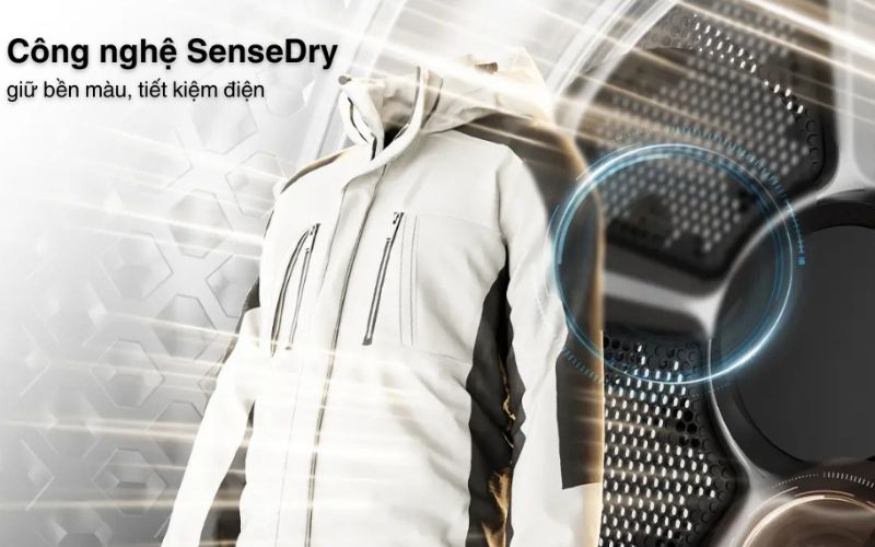Công nghệ SenseDry tích hợp cảm biến độ ẩm thông minh, dựa trên số lượng đồ, chất liệu vải, tự động điều chỉnh chu trình sấy, đảm bảo hiệu quả sấy cao cấp.