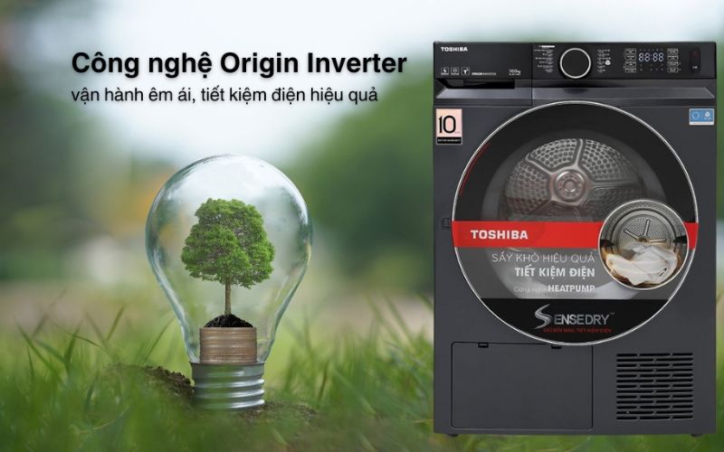 Chiếc máy sấy Toshiba hoạt động trên động cơ truyền động gián tiếp dây Curoa và ứng dụng công nghệ đặc biệt Origin Inverter tối ưu tốc độ vòng quay của động cơ. Máy vận hành êm ái, ổn định, có độ bền cao, sử dụng lâu dài hơn và giảm thiểu lượng điện năng tiêu thụ, tiết kiệm chi phí mỗi tháng cho gia đình.