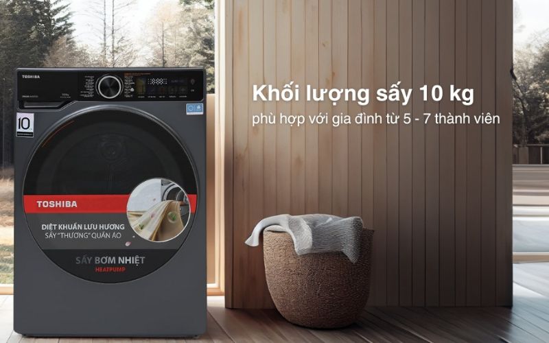 Khối lượng sấy của chiếc máy sấy nhà Toshiba khá lớn lên đến 10 kg, sấy được nhiều đồ trong một lần và đáp ứng tốt nhu cầu sấy, sử dụng của gia đình 5 - 7 thành viên.