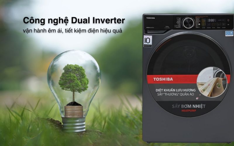 Điểm đặc biệt nữa là bên cạnh cơ chế sấy bơm nhiệt Heat Pump, sản phẩm được tích hợp thêm công nghệ Dual Inverter điều khiển đồng thời hoạt động của động cơ và máy nén nên hiệu suất sấy tối ưu, giảm rung ồn và tiết kiệm điện năng hiệu quả.