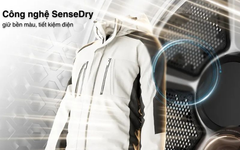 Cảm biến thông minh SenseDry có khả năng đo lường độ ẩm trong sợi vải rồi tự động điều chỉnh nhiệt độ, thời gian sấy phù hợp để có hiệu quả sấy cao nhất, bảo vệ sợi vải và còn tiết kiệm điện năng.