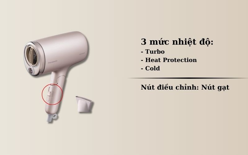 Chiếc máy sấy tóc Panasonic tích hợp 3 mức nhiệt bao gồm Turbo, Heat Protection, Cold dễ dàng điều chỉnh bằng nút gạt nhẹ dễ dàng chuyển đổi giữa các mức nhiệt. Người dùng có thể chọn mức nhiệt mong muốn theo nhu cầu sử dụng, điều chỉnh nhiệt độ tùy vào kiểu tóc và nhu cầu sấy, cho mái tóc được sấy khô hiệu quả.