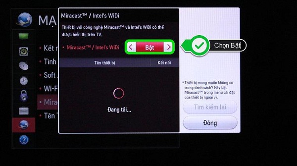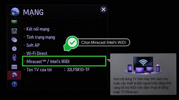 Bước 2: Trên màn hình giao diện cài đặt, nhấn biểu tượng mạng -> chọn mục Miracast / Intel’s WiDi và nhấn Bật để kích hoạt tính năng phản chiếu hình ảnh. Lúc này tivi sẽ hiển thị ở trạng thái chờ kết nối với điện thoại.
