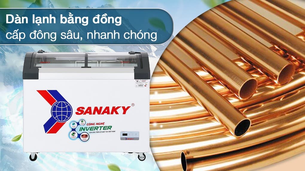 Tủ Đông Sanaky Inverter 280 lít VH-3899K3B sở hữu thiết kế đẹp mắt, sang trọng, cấu hình chắc chắn bền bỉ do được làm từ những vật liệu cao cấp cùng dung tích chứa cực lớn phù hợp với mọi không gian. Sản phẩm sử dụng công nghệ làm lạnh trực tiếp cùng với dàn lạnh đồng nguyên chất truyền nhiệt tốt làm lạnh nhanh, sâu bảo quản thực phẩm tươi tốt. Đặc biệt, tủ có hiệu suất làm lạnh cực tốt cùng khả năng tối ưu hóa năng lượng điện vượt trội nhờ công nghệ Inverter kết hợp môi chất làm lạnh Gas R600a. Ngoài ra, các tiện ích thông minh đi kèm cũng cung cấp thêm cho người dùng nhiều tiện nghi, thoải mái khi sử dụng tủ đông.