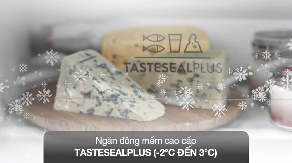 Ngăn đông mềm TasteSeal Plus có thể điều chỉnh nhiệt độ từ -2 đến 3 độ C theo từng loại thực phẩm đáp ứng nhu cầu bảo quản thịt cá tươi sống, phô mai sữa chua hoặc các loại đồ uống.