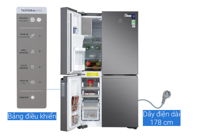 Với dung tích lên tới 680 lít, tủ lạnh Electrolux Inverter 680 lít EQE6879A-Bthuộc dòng ngăn đông dưới cho phép bạn lưu trữ khối lượng thực phẩm lớn. Thiết kế độc đáo 4 cánh – Multi Door, đa dạng kích thước, hộc chứa. Nhờ vậy, dễ dàng cho việc lưu trữ, sắp xếp thực phẩm.