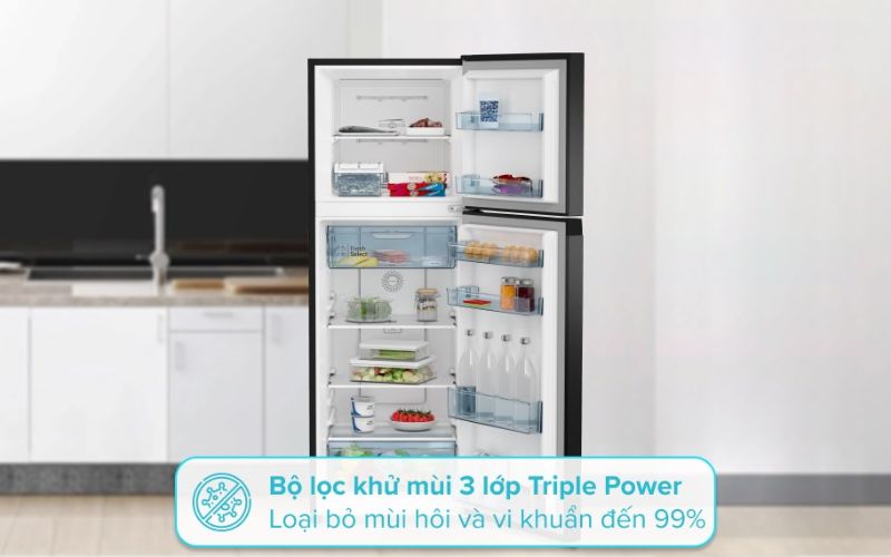 Chiếc tủ lạnh hiện đại nhà Hitachi có sở hữu bộ lọc khử mùi Triple Power cấu trúc gồm 3 lớp có khả năng mạnh mẽ loại bỏ hiệu quả đến 99% các phân tử vi khuẩn, mùi hôi nên trong không gian tủ luôn trong lành sạch sẽ không có mùi hôi khó chịu. Chính nhờ đó, thực phẩm bảo quản sẽ luôn tươi ngon, đầy đủ chất dinh dưỡng, không bị nhiễm khuẩn, ám mùi, ít bị hư hỏng hơn, sử dụng lâu dài vẫn tốt cho sức khỏe.