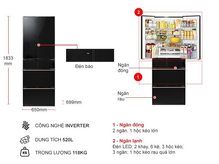 Ngăn lạnh  | Ngăn chân không Ngăn chân không / Kích thước chiều rộng bên trong (cm) : 43.0 Ngăn chân không -1℃ Ngăn chân không Chất xúc tác Platinum và Ruthenium Ngăn chân không Đèn LED Làm lạnh bằng hơi ẩm Làm lạnh nhanh Đèn LED Khay kính cường lực Hộc cửa tùy chỉnh chiều cao Kệ tùy chỉnh chiều cao Hộp phụ kiện với khay trứng  |