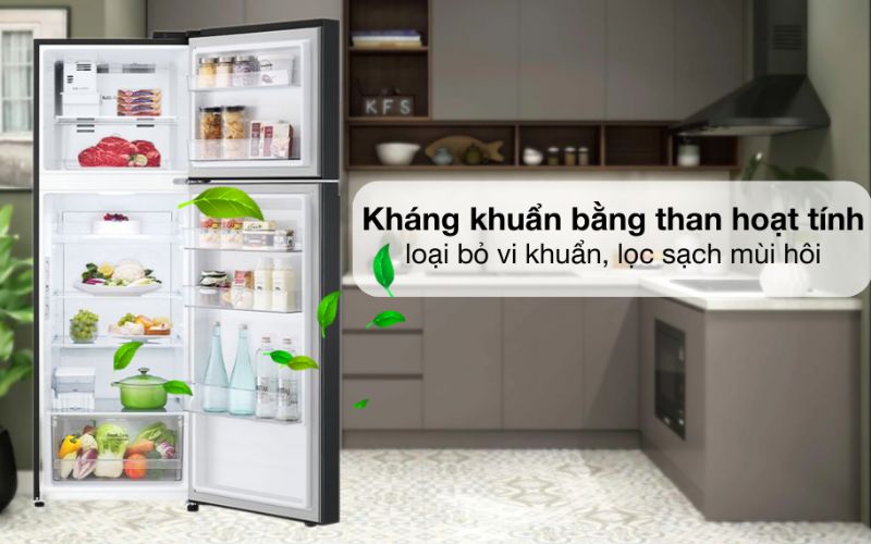 Trong chiếc tủ lạnh LG được trang bị bộ lọc than hoạt tính sử dụng than hoạt tính loại bỏ mùi hôi, vi khuẩn và hạn chế tình trạng lẫn lộn mùi. Không gian luôn được tinh lọc, sạch sẽ, trong lành, giữ thực phẩm luôn sạch khuẩn, tươi ngon, đảm bảo dưỡng chất, an toàn vệ sinh, cung cấp những bữa ăn chất lượng, tốt cho sức khỏe.