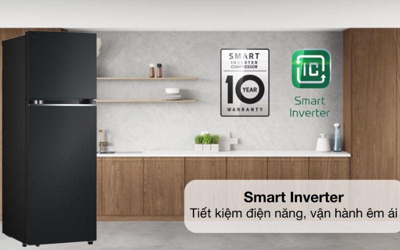 Chiếc tủ lạnh LG thuộc dòng tủ lạnh tiết kiệm điện, ứng dụng công nghệ Smart Inverter tiên tiến tùy chỉnh linh hoạt tốc độ hoạt động, bảo quản thực phẩm hiệu quả nhưng tối ưu đáng kể lượng điện năng tiêu thụ, giảm thiểu chi phí. Smart Inverter còn giúp cả quá trình máy vận hành luôn êm ái, hạn chế tiếng ồn, nâng cao độ bền, kéo dài tuổi thọ, cho gia đình thoải mái, an tâm hơn khi sử dụng.