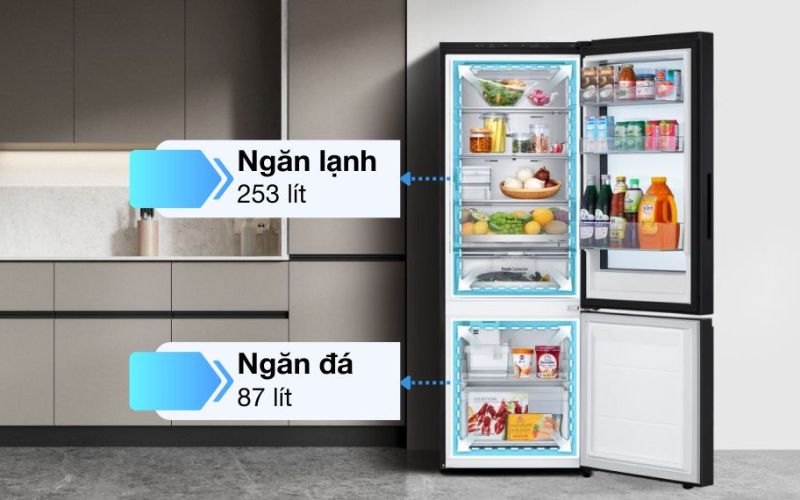 Kiểu tủ lạnh ngăn đá dưới, InstaView hiện đại, dung tích sử dụng lớn 340 lít.